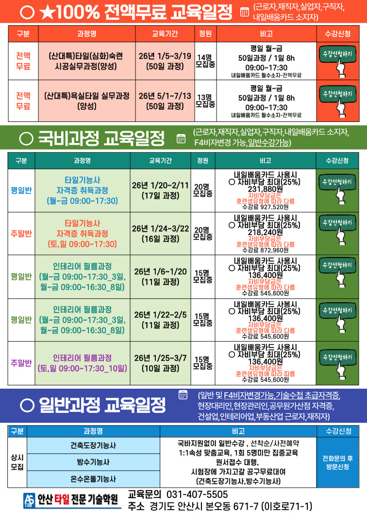 안산타일전문기술학원은 한샘 채용연계 공식인증 훈련기관입니다.
