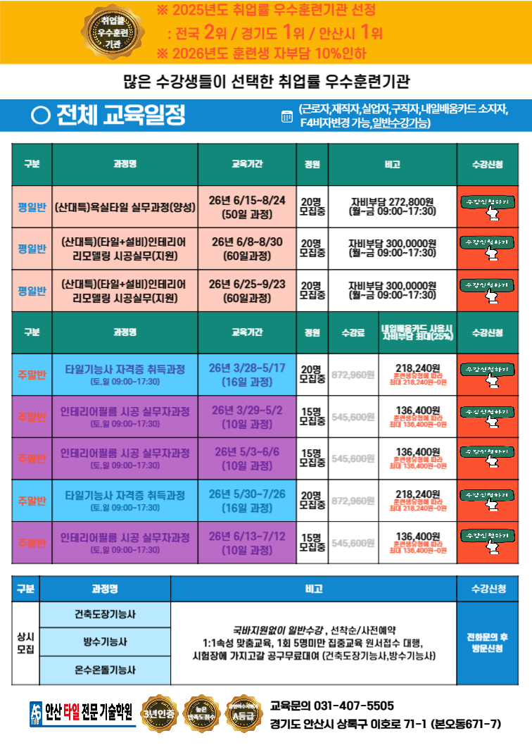 안산타일전문기술학원은 한샘 채용연계 공식인증 훈련기관입니다.